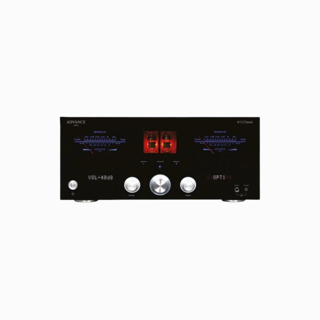 The Advance Paris A12 Classic integrated amplifier blends sophisticated design with high-performance audio. It features a hybrid amplification system, delivering the warmth of tube sound with the precision and control of solid-state components. Ideal for audiophiles, this amp ensures rich, detailed sound with powerful dynamics, perfect for any high-end sound system.