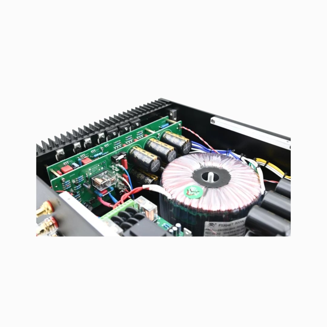 An integrated protection circuit ensures no DC components reach the output, maintaining a residual voltage of under 1mV. To minimize crosstalk and signal interference, the stereo channels are completely isolated after the transformer. Each channel’s power stage is independently buffered through high-grade audio capacitors, providing a total capacitance of 120,000 µF, backed by a custom-built 1 KVA toroidal transformer.