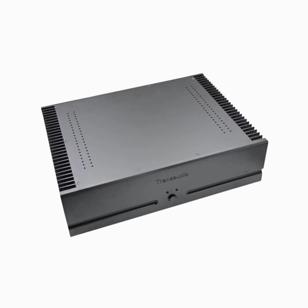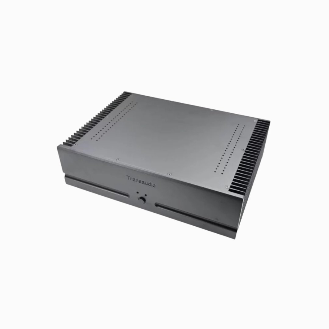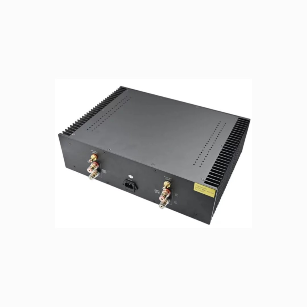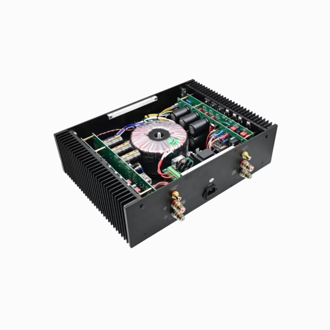 - Output stages run in Class AB massively oversized heatsinks. Overkill of capacitance in the power supply, with a custom toroidal power transformer