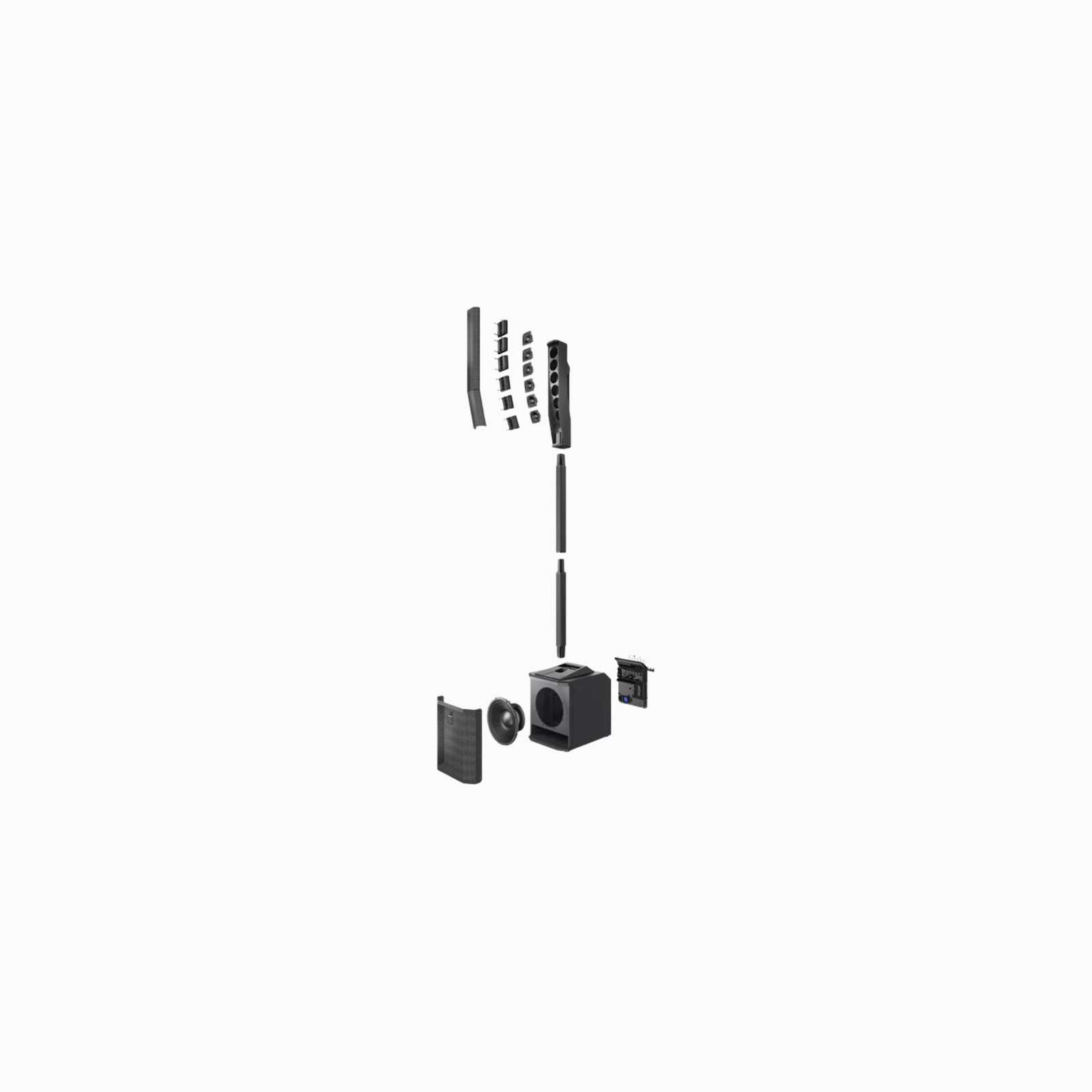 The system’s three-piece design (subwoofer base, spacer pole, and column top) enables fast, tool-less setup and teardown, with a lightweight design that’s easy to transport and store.