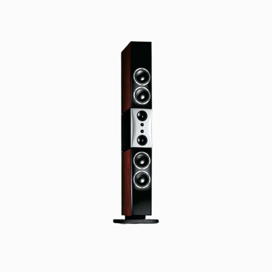 The middle section features a massive CNC-machined solid aluminum baffl,e which houses two special Dynaudio MSP (Magnesium Silicate Polymer) cone midrange drivers and two perfectly matched and meticulously selected Dynaudio coated soft-dome tweeters.