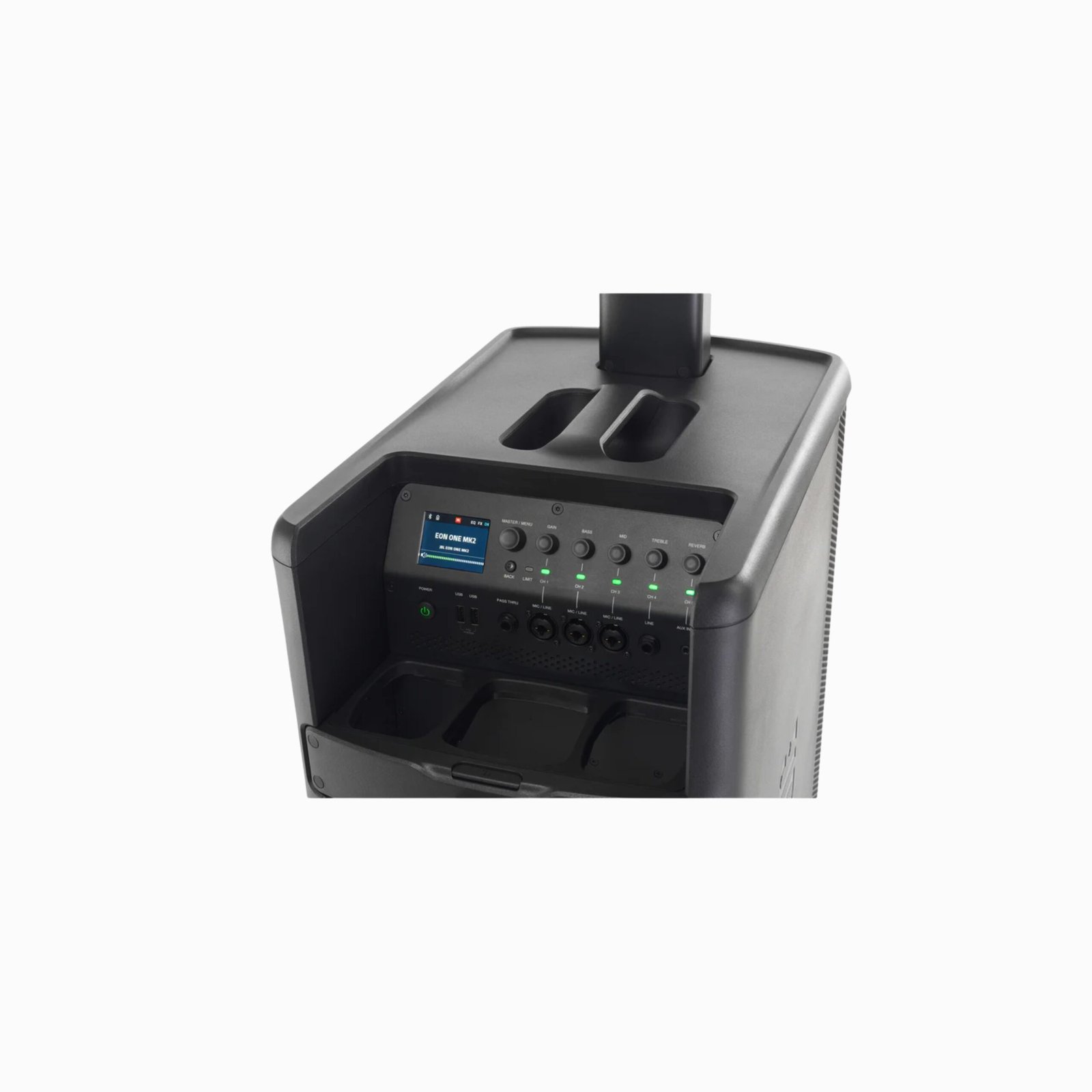 The JBL EON ONE MK2 battery-powered column PA packs a class-leading acoustic package, 5-channel digital mixer, dbx and Lexicon DSP, Bluetooth functions, and universal app control into a lightweight, portable package that can be carried in one hand.