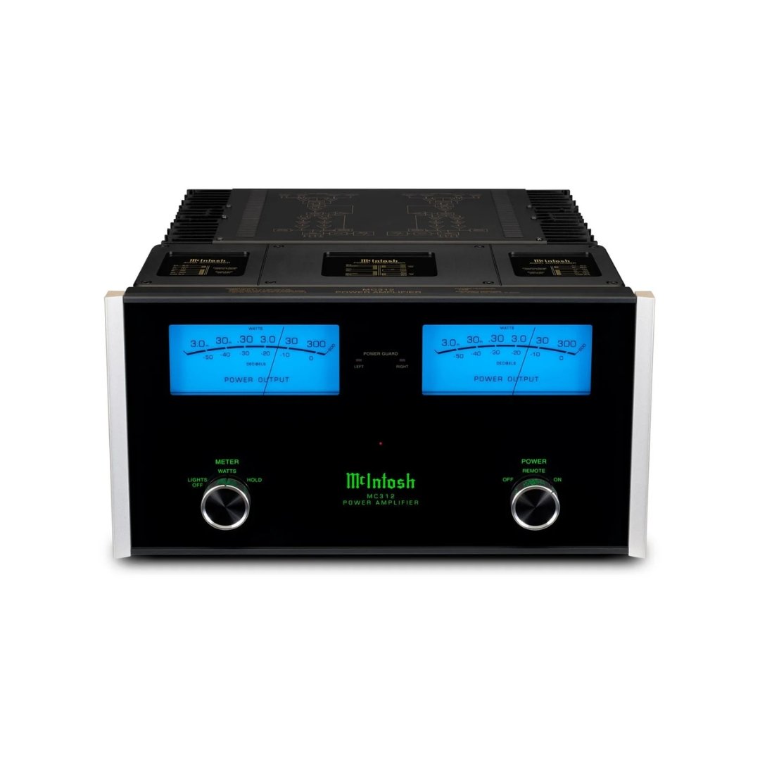 The MC312 sits on a beautiful polished stainless steel chassis and features the timeless McIntosh black glass front panel, illuminated logo, control knobs, aluminum end caps, and a pair of fast responding blue Watt meters.